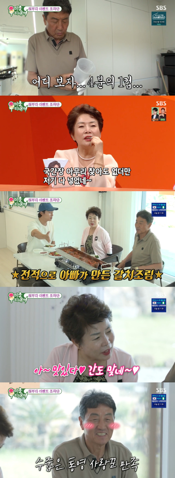 아버지의 첫 요리는 갈치 조림이었다. 허경환 부친은 의외로 거침없이 갈치를 손질했고, 금세 "그래도 바다 사나이인데, 할머니들 하는 거 보고 배웠다"며 허세를 부려 웃음을 안겼다. 하지만 난관은 양념에 있었다. 허경환 부친은 국 간장 계량에 애를 먹으며 양념장을 몇 차례나 다시 만들었고, 허경환 모친은 스튜디오에서 이를 보며 "국간장 한참 찾았더니 저기에 다 넣었네"라 말해 폭소를 자아냈다.
