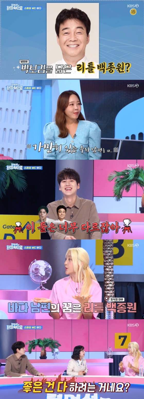 이에 박나래가 "남편분의 꿈은 백종원 씨고, 주변에서 박보검을 닮았다고 하는 거냐"라고 했고, 규현도 "좋은 건 다 하려는 거냐"고 놀려 바다가 웃음을 터뜨렸다.