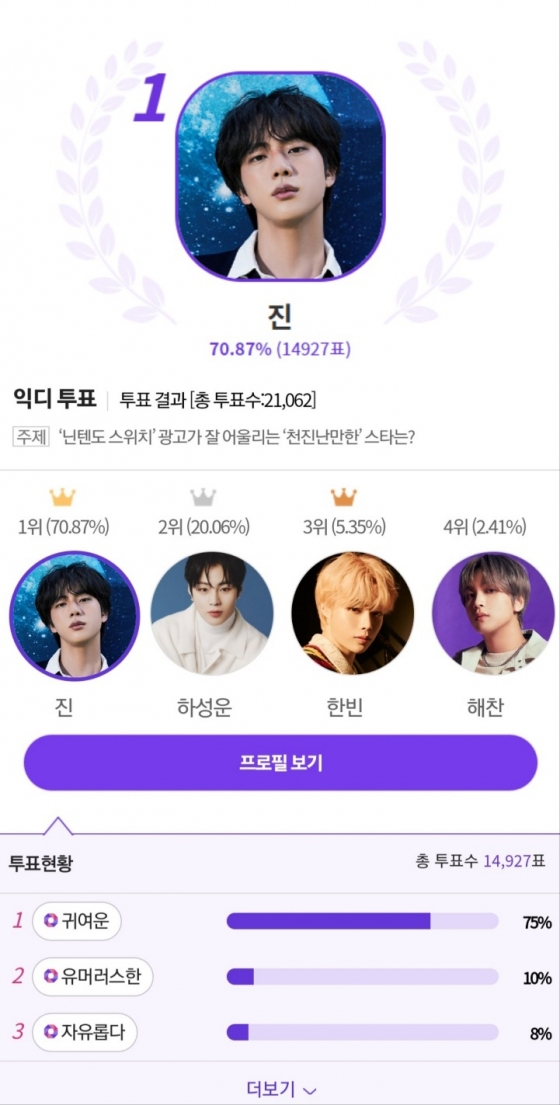 진의 매력으로는 '귀여운'이 75%의 지지율로 1위에 꼽혔다. 이어 '유머러스한' 10%, '자유롭다' 8% 등 순이었다.