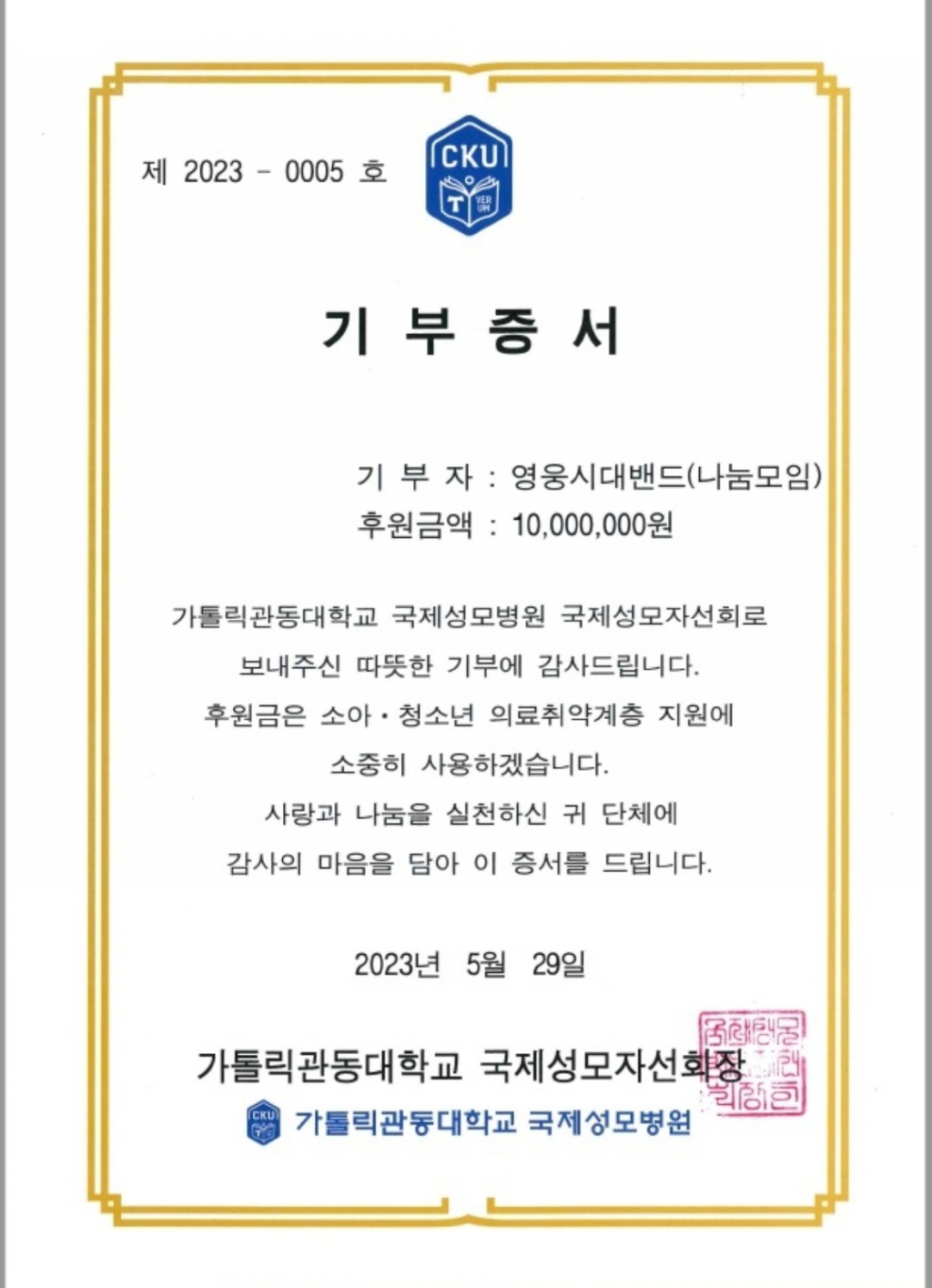 가톨릭관동대 국제성모병원장 김현수 신부는 "선한 영향력을 전파하는 임영웅 씨와 건강한 팬클럽 문화를 이끌어가는 영웅시대밴드에 진심으로 감사드린다"며 "전달받은 따뜻한 마음이 소아·청소년 환아와 보호자에게 잘 전달될 수 있도록 소중한 곳에 사용하겠다"고 말했다.
