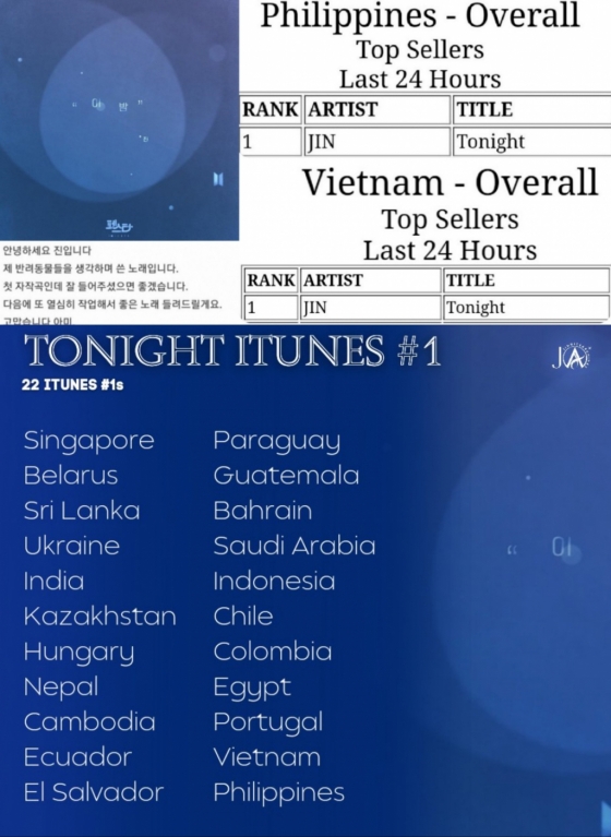 방탄소년단(BTS) 진의 솔로곡 '이 밤(Tonight)'이 아이튠즈(iTunes) 22개국 1위를 달성하며 글로벌 인기를 빛냈다.