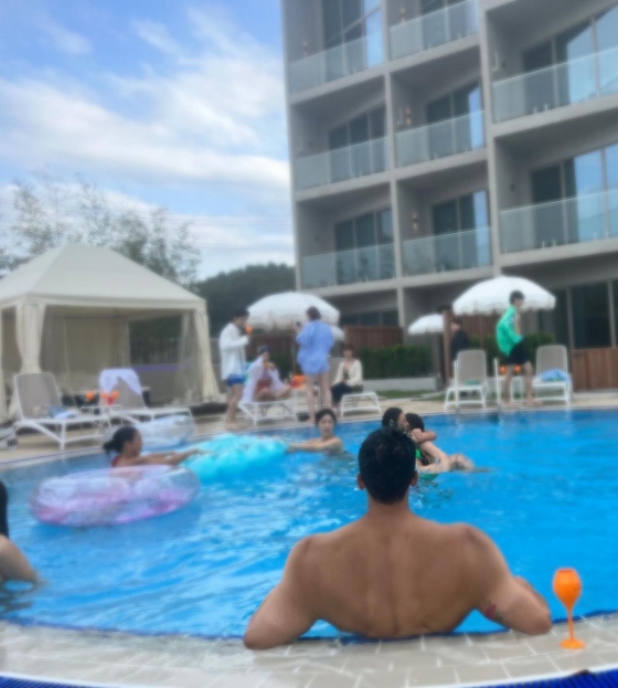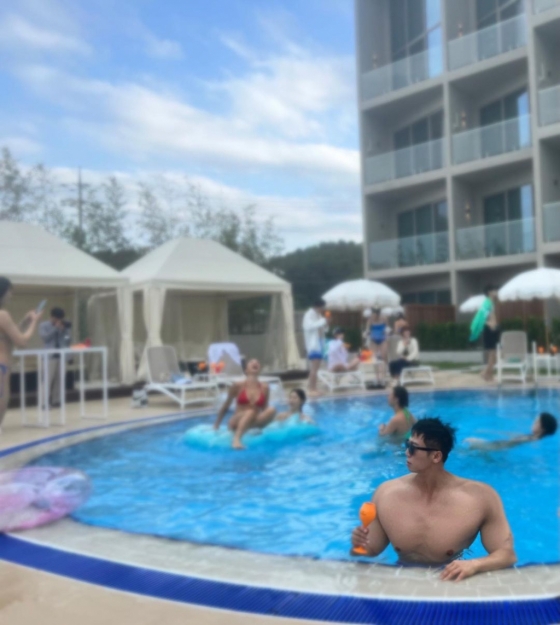 사진 속 유세윤은 강원도의 한 호텔 수영장에서 여유를 즐기고 있는 모습. 유세윤은 상의를 탈의한 채 태평양처럼 넓은 어깨를 뽐내며 완벽한 몸매를 강조했다. 탄탄한 가슴 근육은 CG라고 해도 믿을 정도.