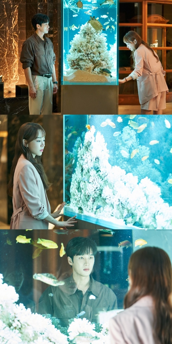 tvN '이번 생도 잘 부탁해' 신혜선과 안보현이 수족관을 사이에 두고 운명적으로 재회한다.