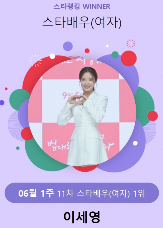 이세영은 지난 1일 오후 3시 1분부터 8일 오후 3시까지 진행된 6월 1주(11차) 스타랭킹 스타배우 여자 랭킹 투표에서 소녀시대 윤아, 박은빈을 꺾고 1위를 차지했다.