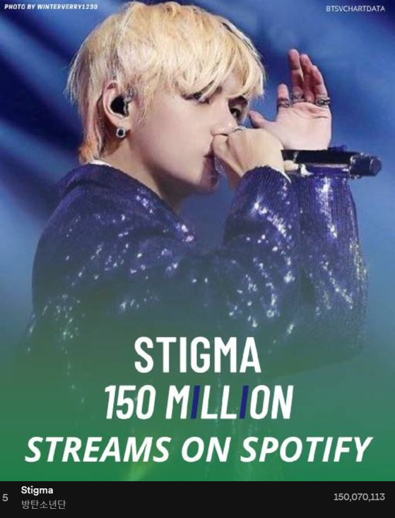 뷔의 'Stigma'는 6월 9일 기준 스포티파이에서 1억 5000만 스트리밍을 넘어섰다.
