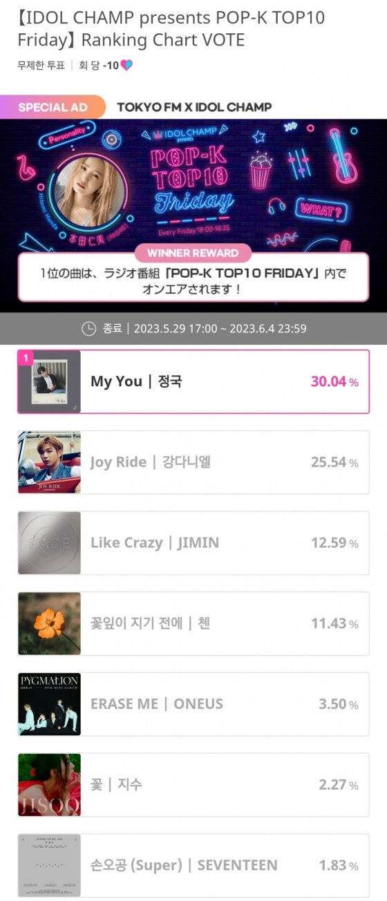 정국의 'My You'는 아이돌챔프(IDOLCHAMP)와 일본 라디오 프로그램 '도쿄 FM'(TOKYO FM)이 5월 29일~6월 4일까지 진행한 'presents POP-K TOP10 Friday' 투표에서 30.04%의 득표율로 1위를 기록했다.