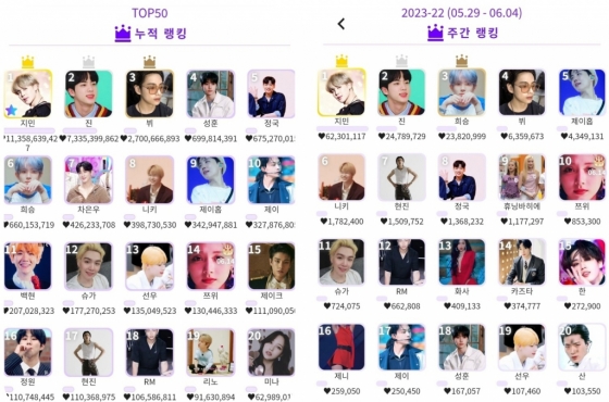 1주간 총 6230만 1117개의 하트를 받아 132주째 1위에 오른 지민은 자신이 보유한 주간랭킹 최다 1위 신기록을 자체 경신하며 글로벌 팬들의 굳건한 응원과 사랑을 입증했다.