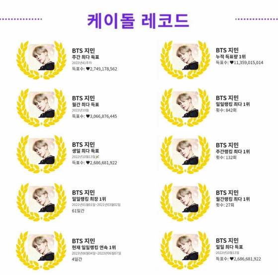 지민은 글로벌 팬들을 대상으로 하는 K팝 아이돌 인기투표 사이트 '케이돌'(KDOL)에서 5월 다섯째주(2023년 5월 29일 - 2023년 6월 4일) 주간 랭킹 1위를 차지했다.