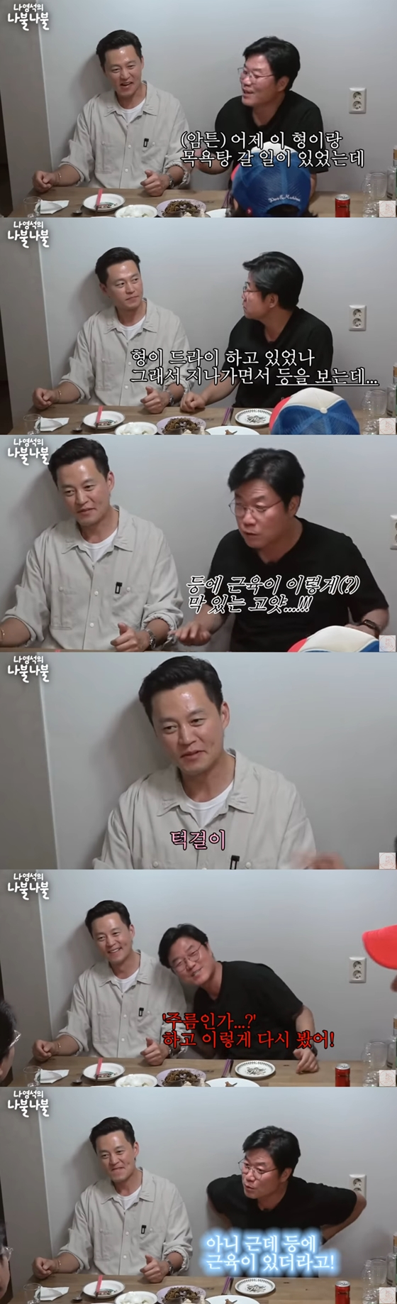 이에 나영석 PD는 "어우. 아니 내가 어제. 이 형이랑 목욕탕 갈 일이 있었는데"라면서 "탕에 이렇게 나왔다가 이 형 저기서 드라이 하고 있었나. 지나가면서 등을 보는데. 등에 근육이 이렇게 있는 거야. 내가 '주름인가?'하고 봤어. 근데 등에 근육이 있더라고"라고 말했다. 나 PD는 등에 근육이 잘 안 생기는데 이서진의 등에 근육이 있었다며 감탄했다.
