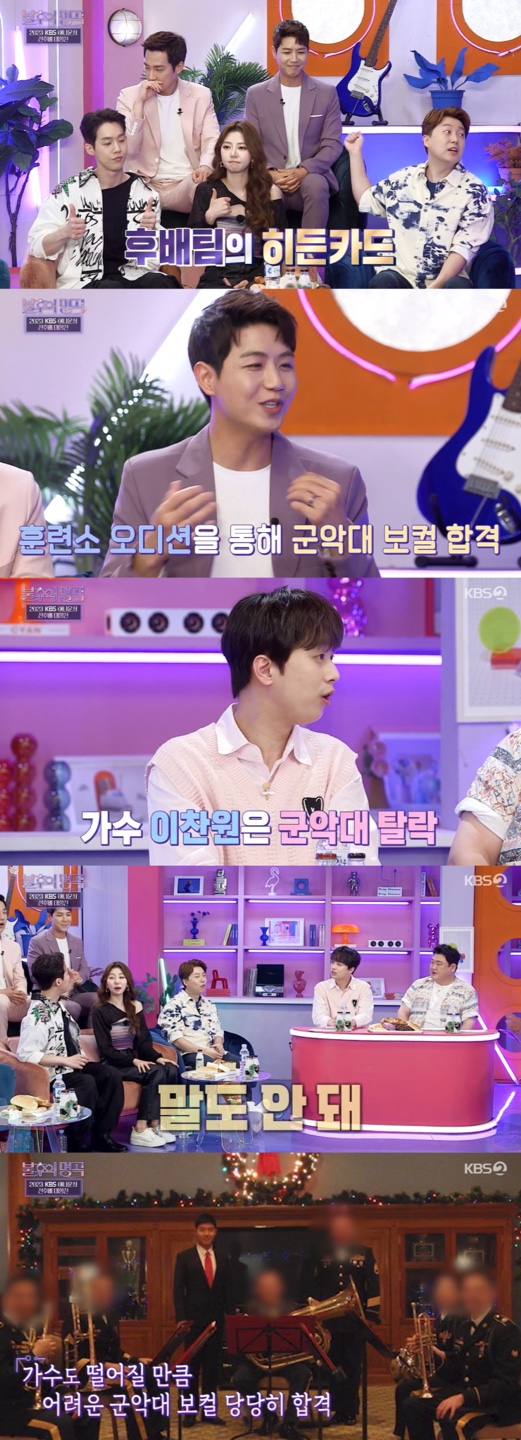 '불후의 명곡' 이찬원이 군 시절 군악대 보컬 오디션 경험에 대해 털어놨다.