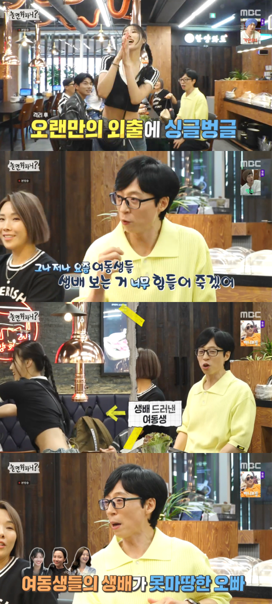 이미주는 이에 평소보다 들뜬 모습을 보여 웃음을 자아냈다. 이때 유재석은 이미주의 짧은 상의를 주목하며 "요즘 여동생들 생배 보는 거 힘들어 죽겠다. 지효도 소민이도 왜 그러냐"고 기겁했다.