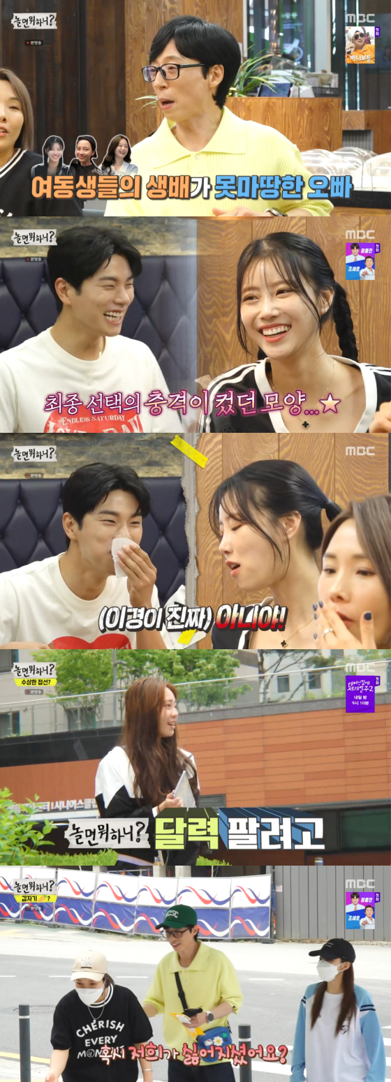 이날 이미주는 코로나19 격리를 마치고 복귀해 평소보다 들뜬 모습을 보였다. 그러나 유재석은 이미주의 짧은 상의를 주목하며 "요즘 여동생들 생배 보는 거 힘들어 죽겠다. 지효도 소민이도 왜 그러냐"고 기겁해 웃음을 자아냈다. 이때 이이경은 "솔직히 배가 생각보다 막 안 예쁘다"고 말해 폭소를 더했다.