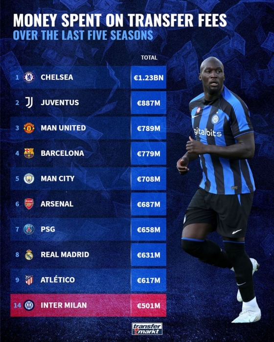 1위는 첼시가 차지했다. 첼시는 지난 5년 간 이적료를 12억 3,000만 유로(약 1조 7,100억 원)를 썼다.
