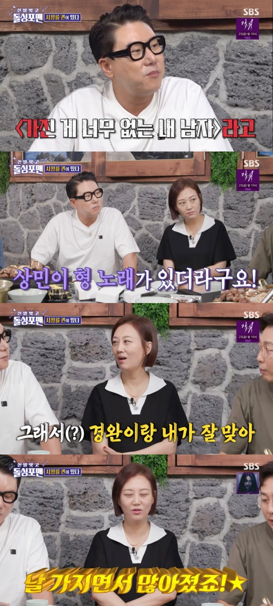 이상민은 "그래서 내가 경완이랑 잘 맞아. 경완이가 가진 게 많지 않아"라고 설명했다. 장윤정은 "날 가지면서 많아졌다"고 말해 감탄을 자아냈다.