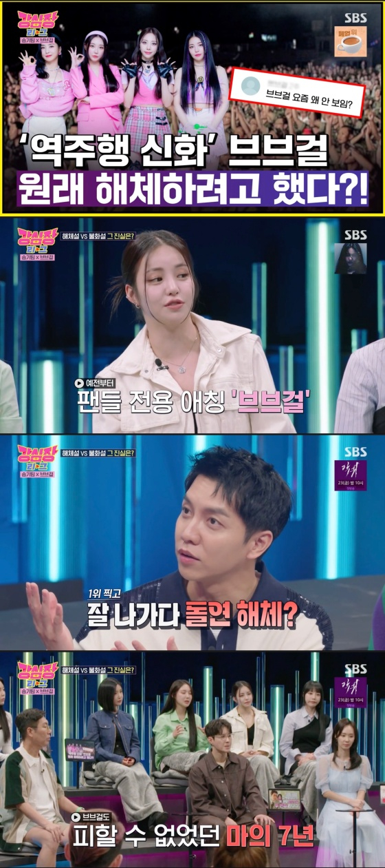 이날 브브걸은 재결합 비하인드를 털어놨다. MC 이승기는 브브걸에 "귀한 기회를 얻었는데 왜 해체 이야기를 하는 건지"라며 궁금해했다. 민영은 "보통 회사랑 7년 계약을 한다. '개인 활동을 할지 그룹 활동을 계속할지' 멤버들끼리 상의를 했다. 멤버들의 나이도 30대가 넘어가고 다양한 방향성에 대해 이야기를 하고 팀 해체 결정했었다"고 밝혔다.