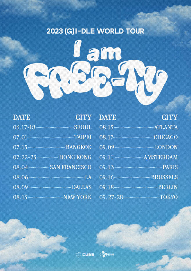 2022년 메가 히트곡 'TOMBOY'에 이어 올해 '퀸카'로 다시금 맹활약을 이어가고 있는 걸그룹 (여자)아이들도 같은 날 옆 동네인 잠실 종합운동장 실내체육관에서 월드투어 '2023 (G)I-DLE WORLD TOUR [I am FREE-TY]' 서울 공연을 연다. 역시 티켓이 오픈되자마자 전석 매진을 기록해 강력한 티켓 파워와 인기를 입증한 (여자)아이들은 서울을 시작으로 타이페이 방콕 홍콩 샌프란시스코 LA 달라스 뉴욕 애틀랜타 시카고 런던 암스테르담 파리 브뤼셀 베를린 도쿄까지 총 16개 지역에서 월드투어를 이어간다.