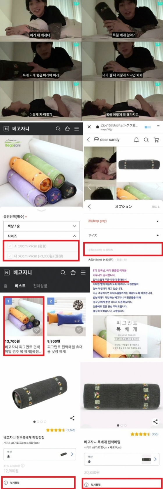또한 '쿠팡'에서 정국이 벤 베개와 똑같은 컬러, 크기의 제품이 연이어 품절 릴레이를 이어갔다.
