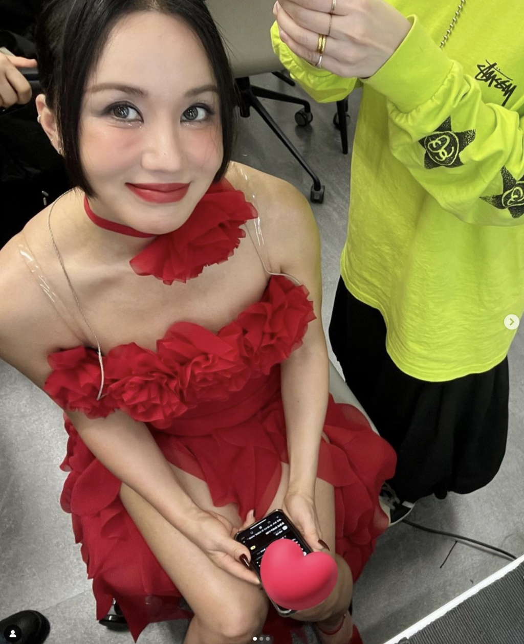 공개된 사진 속 엄정화는 빨간색 무대의상을 입고 미소 지었다. 엄정화는 여전히 아름다운 미모로 시선을 모았다.