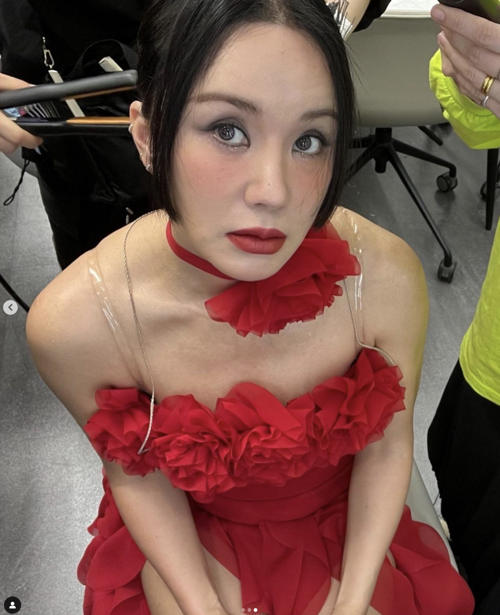 가수 겸 배우 엄정화가 붉은색 무대 의상을 공개했다.