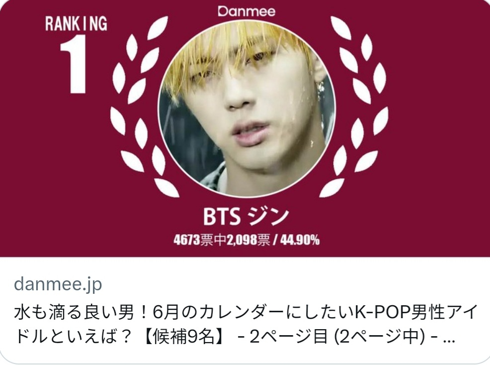 진은 5월 31일부터 6월 7일까지 일본 K팝·한류 전문 미디어 '단미'(Danmee)가 진행한 '물에 젖어도 멋있는 남자! 6월의 캘린더로 하고 싶은 K-POP 남성 아이돌은 누구?' 설문에서 1위를 차지하며 일본에서의 높은 인기를 입증했다.