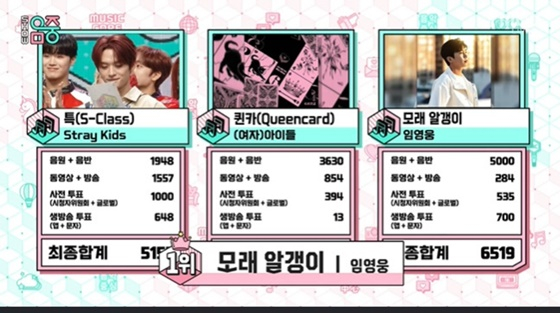 17일 방송된 '음악중심'에서는 그룹 스트레이키즈 '특', (여자)아이들 '퀸카'(Queencard), 가수 임영웅 '모래알갱이'가 1위 후보에 올랐다.
