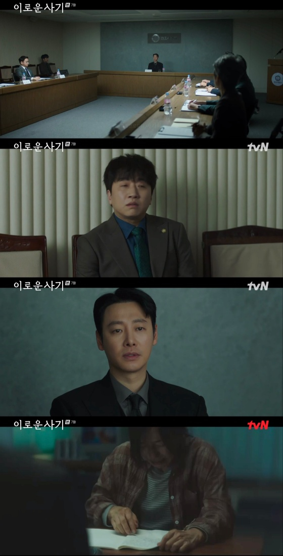 19일 tvN 월화드라마 '이로운 사기'에서 변호사 한무영(김동욱 분)이 징계위원회에서 정직 3개월의 처분을 내려졌다.