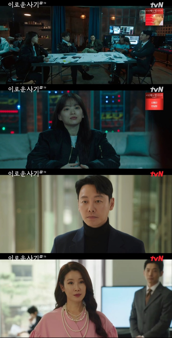 19일 tvN 월화드라마 '이로운 사기'에서 한무영(김동욱 분)이 나비스 웰빙의 얼굴인 장경자(이태란 분)와 직접 대면하겠다고 말했다.