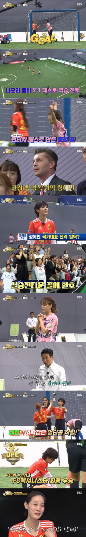 기세가 오른 '액셔니스타'는 후반전 초반부터 강하게 몰아붙였다. 후반 2분, 사오리의 공을 가로챈 정혜인이 침착한 땅볼 슈팅으로 추가골을 기록하며 완벽한 리드를 잡아냈다. '월드클라쓰'는 곧이어 페널티킥 기회를 얻어냈지만 사오리의 슈팅이 골문을 빗나가며 기회를 살리지 못했다. 사오리마저 자책에 빠지자 작전타임으로 선수들을 부른 이을용 감독은 "우승하는 건 그 팀의 운도 따라야한다. 매 경기 최선을 다해 올라왔다. 마지막 경기도 재밌게 즐겨야 한다"고 선수들을 격려했다.