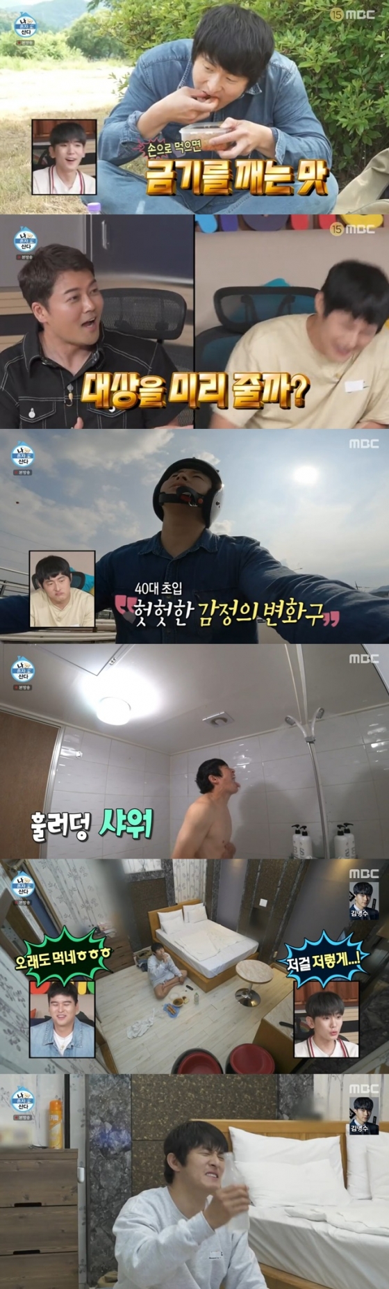 숙소에서 샤워를 마치고 나온 그는 어김없이 방바닥에 앉아 편의점에서 구입한 소주를 병채로 들이키고, 식당에서 포장한 추어탕을 맛있게 먹었다. 이후 가수 성시경의 노래를 들으며 고독한 시간을 즐겼다. 그는 "사회와 단절된 느낌을 받는다"며 "낯선 지역의 낯선 모텔에 혼자 와서 자면 우주에 혼자 남겨진 느낌이 있다"고 말했다. 취기가 오르자 절친한 형 전현무에게 전화를 걸어 속내를 털어놓기도 했다. 그는 오후 8시 즈음 밖을 나서 노래방으로 향했다. 그는 홀로 노래방에 앉아 이별의 슬픔이 담긴 노래를 열창하며 감성에 젖었다. 노래 중간 눈물을 흘리기도 했다.