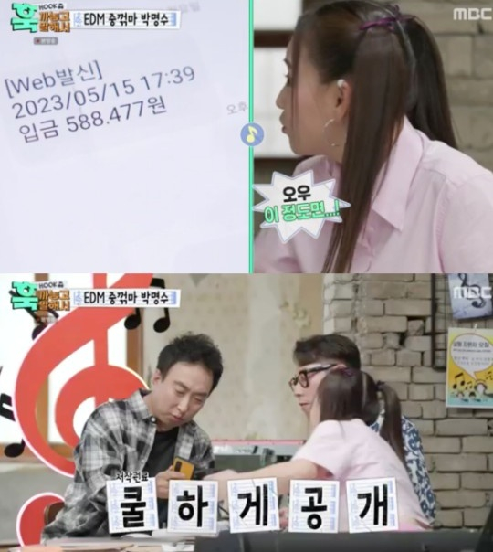 24일 오후 방송된 MBC '훅 까놓고 말해서'에서는 저작권 수익 입금 메시지를 공개하는 박명수의 모습이 그려졌다.