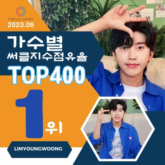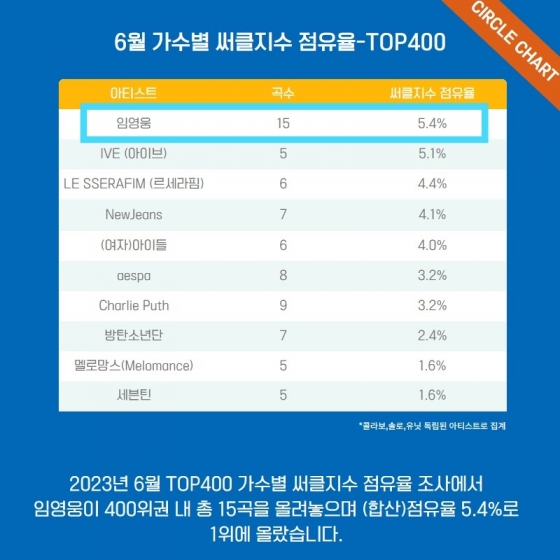 임영웅은 써클차트가 발표한 6월 가수별 써클지수 점유율 TOP400에서 합산 점유율 5.4%를 기록, 1위를 차지했다.