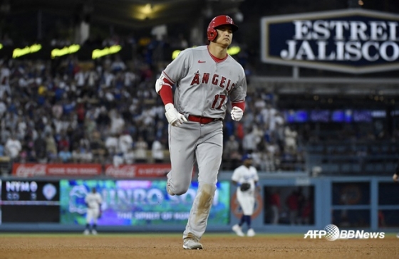 오타니 쇼헤이가 9일(한국시간) 다저스전에서 7회 투런 홈런을 터트리고 그라운드를 돌고 있다. /AFPBBNews=뉴스1