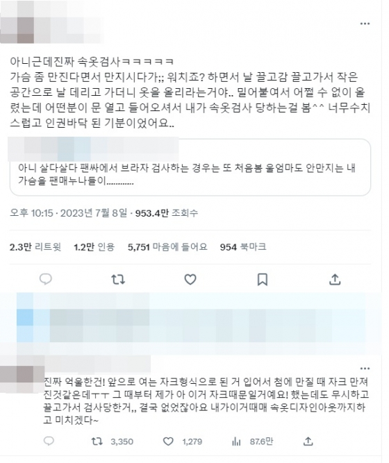 또 다른 네티즌은 "가슴 좀 만진다면서 만지시다가 워치죠? 하면서 날 끌고감. 끌고가서 작은 공간으로 날 데리고 가더니 옷을 올리라는 거야.. 밀어붙여서 어쩔 수 없이 올렸는데 어떤 분이 문 열고 들어오셔서 내가 속옷 검사 당하는 걸 봄. 너무 수치스럽고 인권 바닥 된 기분이었어요"라고 글을 올렸다.