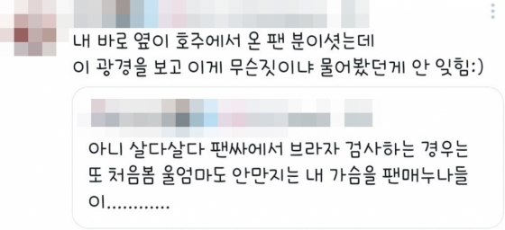 이날 팬사인회 이후 온라인에는 한 네티즌이 "아니 살다살다 팬싸에서 브라자 검사하는 경우는 처음 본다. 울 엄마도 안 만지는 내 가슴을 팬매누나들이..."라며 팬매니저가 팬사인회에서 녹음이나 촬영기기 검사를 하면서 자신의 속옷을 검사했고, 가슴까지 만지는 일을 겪었다고 주장했다.
