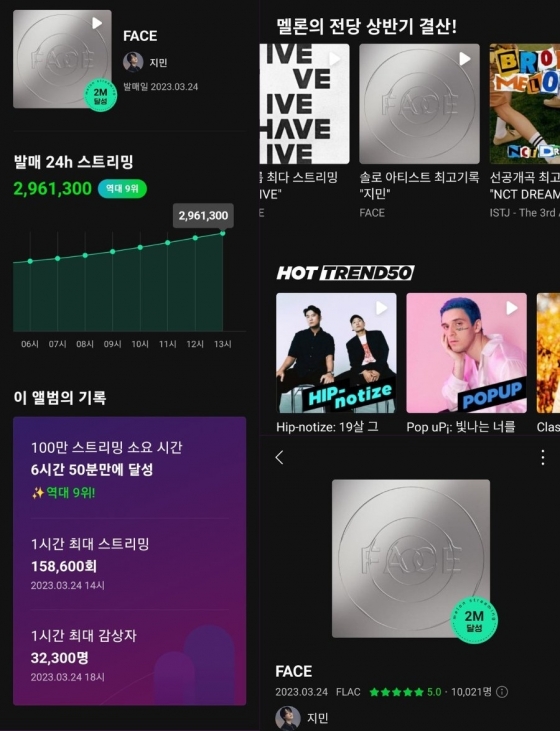 국내 최대 뮤직 플랫폼 '멜론'의 2023년 상반기 결산에 따르면 지민의 솔로 앨범 '페이스(FACE)'는 발매 6시간 50분 만에 100만, 24시간 만에 290만 이상 스트리밍을 기록, 역대 9위에 올랐으며 솔로 아티스트 가운데 최고의 기록을 세웠다.