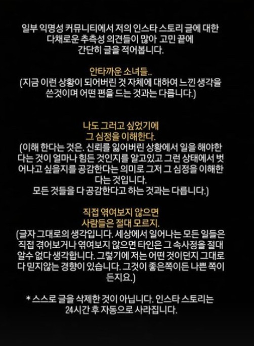길학미는 지난 9일 자신의 인스타그램 스토리를 통해 "일부 익명성 커뮤니티에서 내 인스타 스토리 글에 대한 다채로운 추측성 의견들이 많아 고민 끝 간단히 글을 적는다"라고 말문을 열었다.