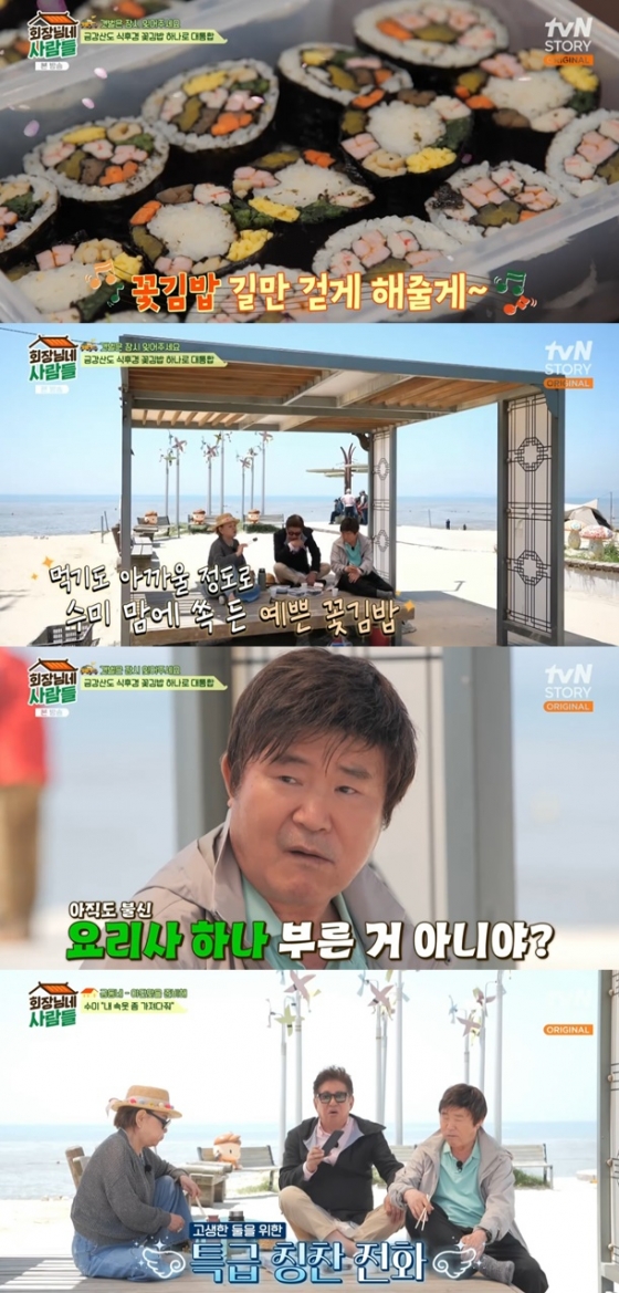 이후 김용건은 김밥부터 먹자며 금동부부의 도시락을 꺼냈다. '꽃김밥'의 비주얼은 본 세 사람은 감탄을 쏟아냈다. 이어 맛을 본 김수미는 "예술이다. 김밥 하나에 사람이 이렇게 기분이 좋아지냐"며 "먹기도 아깝다. 이거 배워서 손녀딸 해줄 거다"라고 칭찬했다.