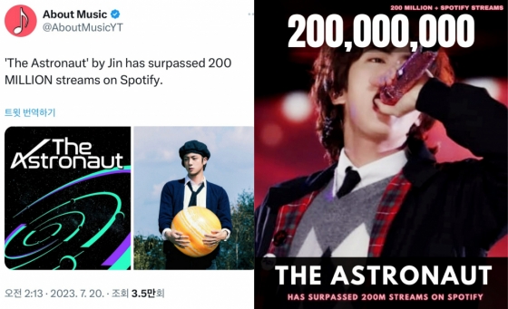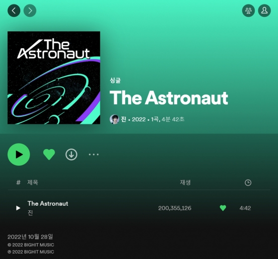 진의 솔로곡 '디 애스트로넛'이 스포티파이에서 7월 20일 2억 스트리밍을 넘어서며, '끝나지 않을 히스토리'를 만들어 가고 있다.