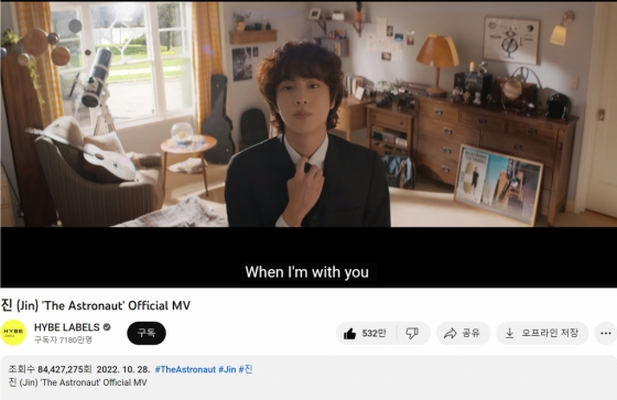 진의 '디 애스트로넛' 공식 뮤직비디오는 8442만 뷰를 넘어섰고, 아르헨티나에서 콜드플레이와 함께 한 무대 영상은 2318만 뷰를 넘어서며, 글로벌한 특급 인기를 이어가고 있다.