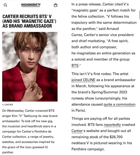 글로벌 패션&라이프스타일 매거진 '하이스노바이어티(Highsnobiety)는 이 소식과 함께 팬들이 온라인 판매처를 방문해 뷔가 팬더 캠페인에서 착용한 2만 6700달러(한화 3440만원)에 달하는 목걸이의 재고를 모두 사들이고 있다고 전했다.