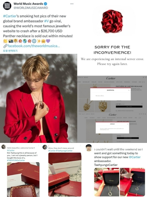 뷔가 까르띠에 글로벌 앰버서더로 발탁된 사실이 알려지자 불과 몇 분 만에 까르띠에 웹사이트는 트랙픽 급증으로 인해 한동안 다운돼 놀라움을 안겼다.