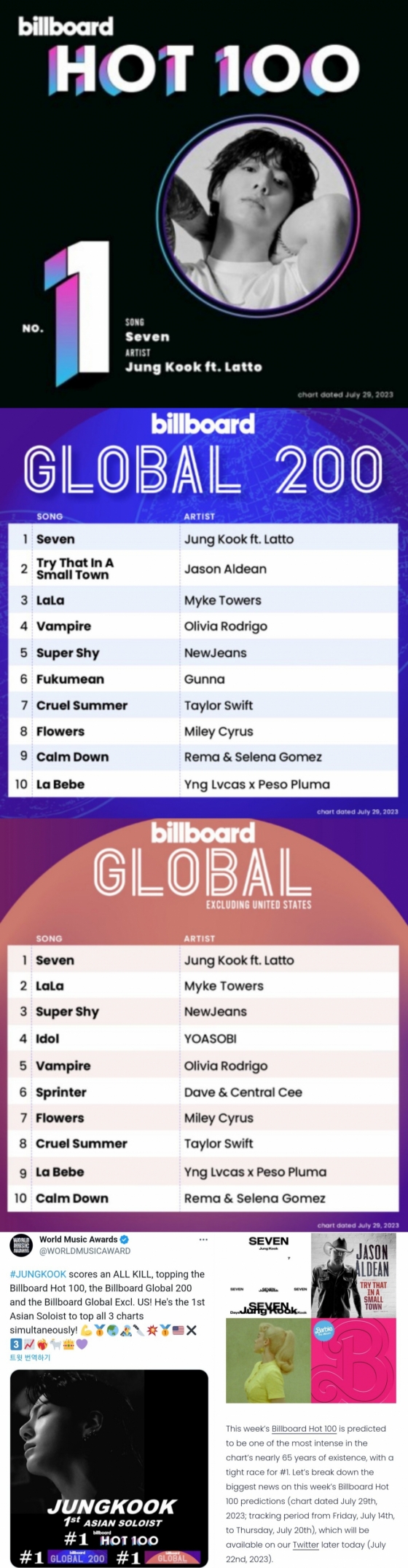 'Seven'은 '핫 100' 1위 외에도 빌보드 '글로벌 200' 차트 1위, '글로벌 미국 제외'(Excl. U.S.)차트 1위까지 모두 휩쓸며 '퍼펙트 올킬'을 달성했다.