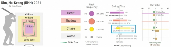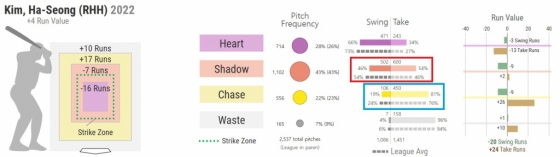 아울러 스트라이크존에서 벗어난 '체이스'의 테이크 비율은 86%(325구 중 278번), '웨이스트'는 98%(94구 중 92번)로 거의 배트를 내지 않았다. 둘을 합하면 스트라이크에서 벗어난 공의 88%(419구 중 370번)는 스윙을 하지 않고 골라낸 셈이다. 덕분에 올해 득점 가치 총계도 +5로 더 올랐다.