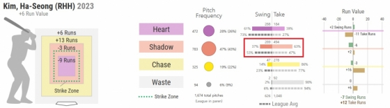 올해는 공을 골라내는 범위를 스트라이크존 '벗어난 곳'에서 '경계'까지 좁히면서 비약적인 발전이 있었다. 2022년 김하성과 2023년 김하성의 가장 큰 차이점은 스트라이크이거나 살짝 벗어난 '경계'에서의 스윙 비율이다. 2022년 김하성은 스트라이크존 경계에서 리그 평균(54%)보다 적은 46%의 스윙 비율을 보였다. 올해는 37%로 스윙을 9%p 줄인 대신 지켜보는 빈도를 늘려 스윙을 하지 않는 '테이크' 수치가 54%에서 63%(783구 중 494번)로 늘어났다. 때문에 스트라이크존 경계에서 득점 가치가 2021년 -9점, 2022년 -7점, 2023년 -3점으로 상승해, 득점에 대한 기대치도 높아졌다.