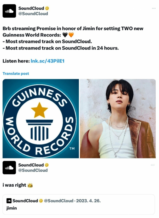 방탄소년단(BTS) 지민의 2개 부문 기네스 세계 신기록 추가 수립에 사운드클라우드와 팬들의 축하가 이어졌다.
