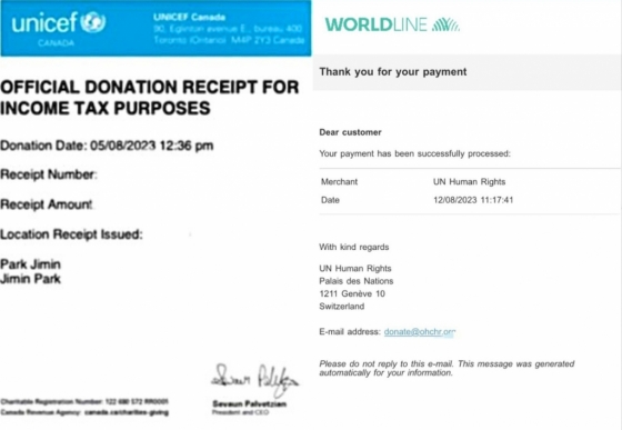 한편 캐나다 지민 팬베이스는 "지민의 기네스 세계 기록 3관왕을 기념해 유니세프에 기부금을 전달했다"고 알렸으며, 또 다른 지민의 팬은 세계 인권 증진과 보호를 위한 기부금을 'UN HUMAN RIGHTS'에 기탁해 모범 팬덤다운 선행으로 훈훈함을 더했다.