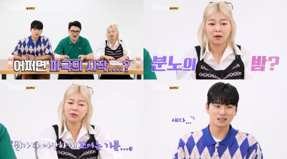 이날 한 솔로녀는 한 솔로남을 따로 불러내 "조금 경각심을 가지고 (호감녀를) 알아보는 게 좋지 않나 싶다. 이 정도 들었으면 똑똑하게 움직일 수 있을 거라 생각한다"는 조언을 건넸다. 이어 솔로녀는 "제가 지금 하나 드렸다"며 생색까지 거하게 냈다. 경각심이라는 단어를 들은 솔로남은 멘붕에 빠졌고, 그대로 자신의 호감녀를 불러내 "혹시 마음의 변화가 있었냐?"라고 질문을 던졌다.