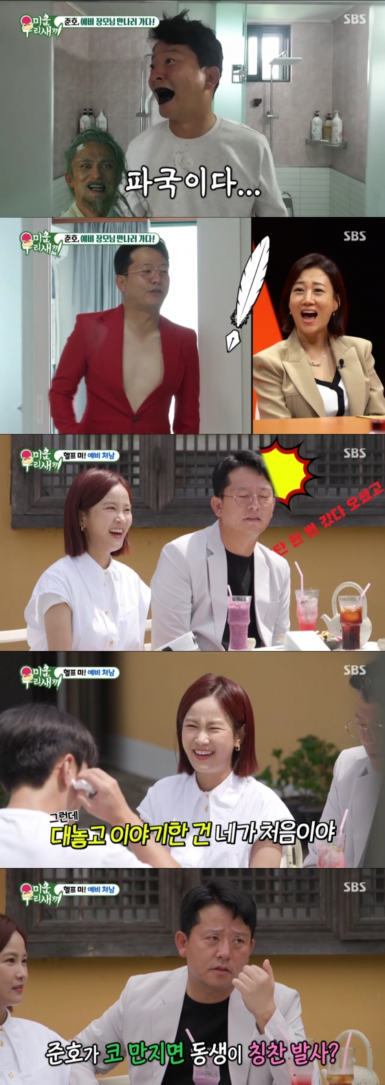 이어 두 사람은 김지민의 남동생을 만나 어색하게 인사를 나눴다. 지민과 사귄다고 했을 때의 동생으로서의 심경을 묻자 지민의 남동생은 "누나가 뭐가 아쉬워서 한번 갔다 오신 분을"이라고 솔직하게 말했고, 김준호는 당황하면서도 "지민이를 생각하는 건 내가 1등이다"라며 깨알같이 본인의 장점을 어필했다. 어머님 앞에서 개그를 선보일 테니 크게 호응해달라는 김준호의 주문에 남동생은 기합까지 내지르며 심기일전하는 모습을 보였지만, 이내 "나 못하겠어"라고 난색을 표해 큰 웃음을 자아냈다. 어영부영 지민의 남동생을 포섭하는데 성공한 김준호는 드디어 예비 장모님을 만나러 집을 방문했다. 과연 예비 장모님과의 첫 만남은 어떤 모습일지, 다음 주 공개될 이야기에 기대감이 고조됐다.