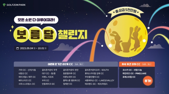 ㈜골프존(각자대표이사 박강수·최덕형)이 추석을 앞두고 오는 10월 1일까지 4주간 전국 골프존파크 매장에서 풍성한 경품 혜택의 '모든 소원 다 이루어져라! 보름달 챌린지'를 진행한다고 4일 밝혔다.