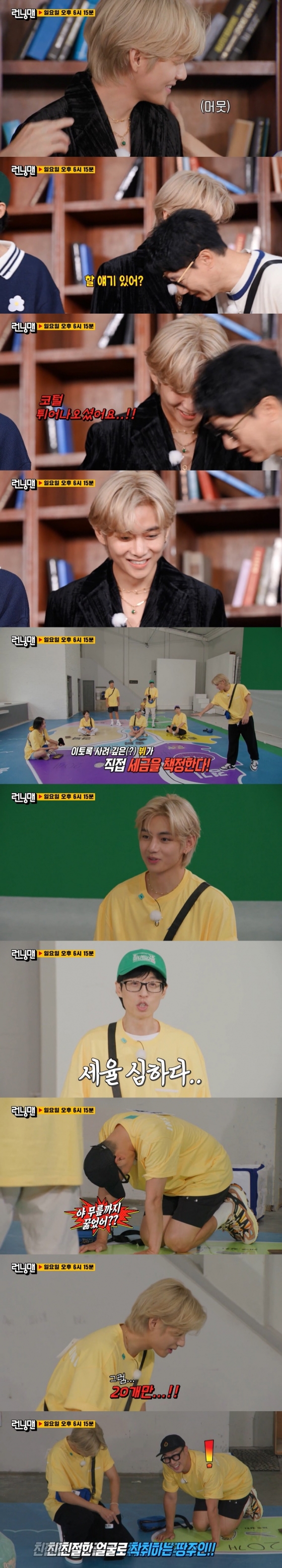 뷔는 정신없는 틈을 타 지석진에게 "코털 튀어나오셨어요"라고 말해 웃음을 자아냈다.